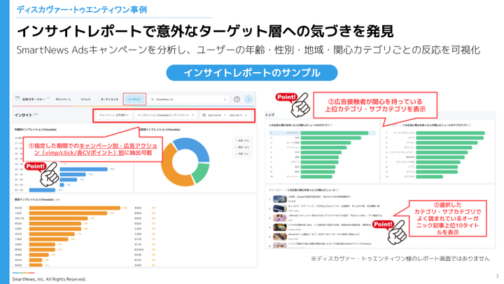 北野氏:インサイトレポートが非常に見やすく、よく活用しています。年齢層と男女比が視覚的に確認できるので、狙ったところに届いているかをチェックできますし、逆に想定外の層にも届いているという発見もあるのがおもしろいところです。