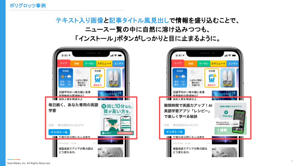 特に見出しは、主要SNS広告とはまったく異なるSmartNewsに特化したアプローチが必要です。例えば、主要SNS広告では「スキマ時間で英語力アップ AI英語学習アプリレシピー」と機能的な訴求で完結させる一方、SmartNewsでは「レシピーで楽しく学べる秘訣」まで含めて、記事タイトル風に仕上げます。