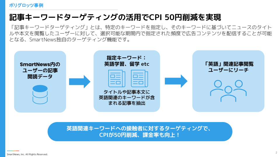 さらに最近では、記事キーワードターゲティングを導入しました。英語関連のキーワードを設定して配信したところ、CPIが50円削減、課金率も向上という成果につながりました。